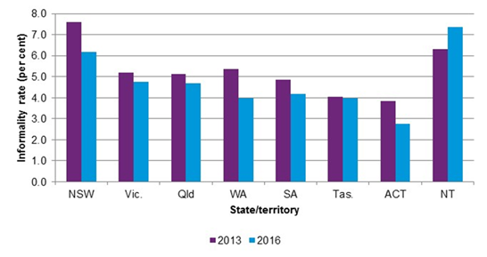 The national informality rate (informal votes as a percentage of all votes cast) decreased from 5.91 per cent of all votes cast at the 2013 House of Representatives elections to 5.05 per cent at the 2016 House of Representatives elections. At the state and territory level, the highest informality rates for the 2016 House of Representatives elections were in the Northern Territory, New South Wales and Victoria, while the lowest informality rates were in the Australian Capital Territory, Tasmania and Western Australia.